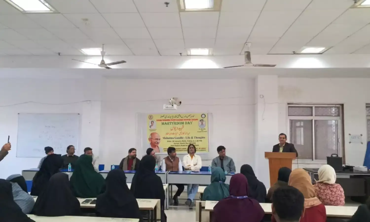 इस महत्वपूर्ण कार्यक्रम की अध्यक्षता उर्दू विभाग के वरिष्ठ एवं प्रतिष्ठित प्राध्यापक प्रोफेसर सौबान सईद ने की। अपने अध्यक्षीय संबोधन में उन्होंने महात्मा गांधी के जीवन और विचारों पर विस्तार से प्रकाश डालते हुए कहा कि गांधी जी केवल भारत के स्वतंत्रता संग्राम के नेता ही नहीं थे, बल्कि वे एक समग्र नैतिक और बौद्धिक व्यवस्था के प्रवर्तक भी थे। उन्होंने कहा कि महात्मा गांधी का जीवन सादगी, सत्य और अहिंसा की व्यावहारिक व्याख्या है जिसमें व्यक्तिगत चरित्र और सामूहिक उत्तरदायित्व के बीच गहरा संबंध दिखाई देता है।