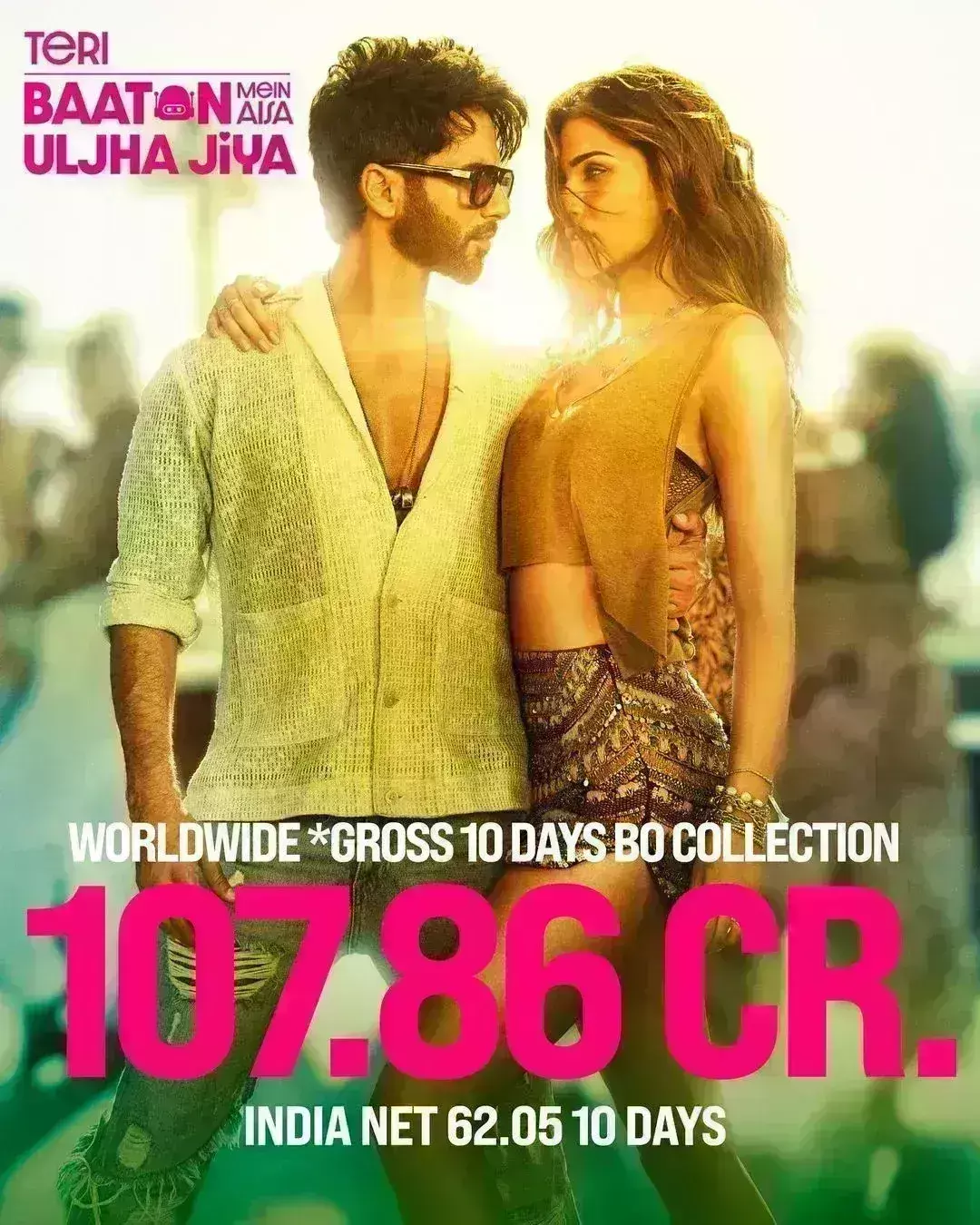 शाहिद कपूर और कृति सेनन की फिल्म तेरी बातों में ऐसा उलझा जिया ने बॉक्स-ऑफिस पर शानदार प्रदर्शन किया है. वैलेंटाइन डे के मौके पर रिलीज हुई इस फिल्म ने पहले ही हफ्ते में धमाकेदार कमाई की और अब दूसरे हफ्ते में भी फिल्म की धुआंधार रफ्तार जारी है. आइए बताते हैं इस फिल्म ने रिलीज के 10 दिन के अंदर बॉक्स-ऑफिस पर कुल कितने करोड़ रुपये कमाए हैं. फिल्म तेरी बातों में ऐसा उलझा जिया ने बीते शनिवार को बॉक्स-ऑफिस पर 6 करोड़ रुपये का कलेक्शन दर्ज किया जिसके साथ फिल्म की देशभर में कुल कमाई 58.20 करोड़ रुपये तक जा पहुंची है.