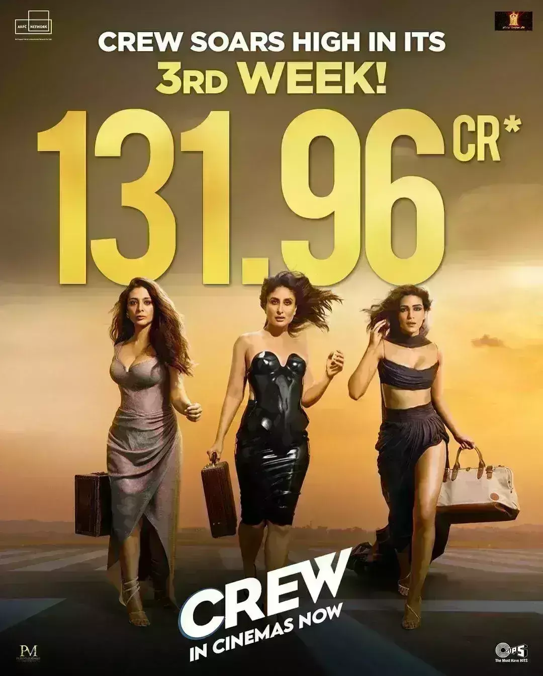 करीना कपूर, तब्बू और कृति सेनन अभिनीत फिल्म क्रू सिनेमाघरों में टिकी हुई है। यह फिल्म 29 मार्च को रिलीज हुई थी। पहले दिन से ही दर्शकों ने इसे हाथोंहाथ लिया। तीन अभिनेत्रियों के कंधों पर टिकी फिल्म ने कमाल कर दिया, जो अभी तक जारी है। यह फिल्म न सिर्फ देश में शानदार प्रदर्शन कर रही है, बल्कि विदेशों में भी दर्शकों को सिनेमाघरों तक खींचने का सिलसिला जारी है। 100 करोड़ क्लब में एंट्री पा चुकी क्रू के कदम अब 150 करोड़ की तरफ तेजी से बढ़ रहे हैं।राजेश ए कृष्णन के निर्देशन में बनी फिल्म क्रू ने पहले और दूसरे सप्ताह शानदार प्रदर्शन किया।