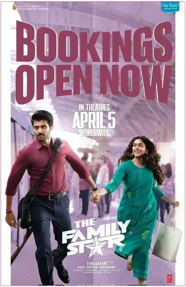 स्टार हीरो विजय देवराकोंडा की आगामी फिल्म फैमिली स्टार अगले शुक्रवार को सिनेमाघरों में भव्य रिलीज के लिए तैयार है। फिल्म के लिए टिकट बुकिंग पहले ही शुरू हो चुकी है। अपने टीजऱ, गीतात्मक गीतों और ट्रेलर की रिलीज़ के बाद, फैमिली स्टार ने जबरदस्त चर्चा पैदा कर दी है। यह उत्साह टिकट बुकिंग में भी साफ़ दिख रहा है, सिनेमाघरों और मल्टीप्लेक्स दोनों में टिकटें तेज़ी से बिक रही हैं।