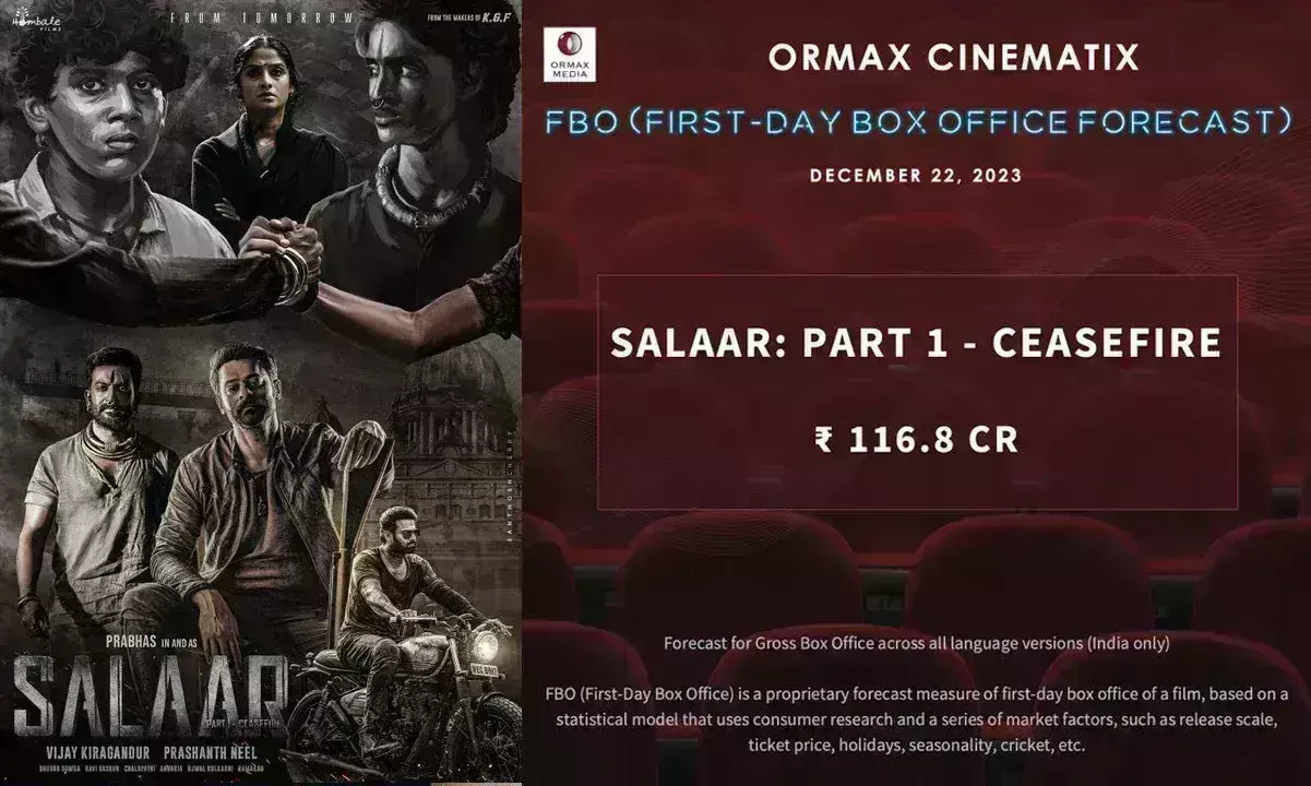 यहां तक कि सालारÓ ने शाहरुख खान की साल की सबसे बड़ी फिल्म जवान का रिकॉर्ड भी चकनाचूर कर दिया है. चलिए यहां जानते हैं सालार ने कितनी बंपर ओपनिंग की है.रिपोर्ट के मुताबिक सालार अपनी रिलीज के पहले दिन 95 करोड़ की ऐतिहासिक ओपनिंग कर सकती है. हालांकि ये अर्ली एस्टीमेट है ऑफिशियल डाटा आने के बाद इन नंबर्स में थोड़ा बहुत बदलाव हो सकता है. ऑरमैक्स मीडिया ने भी सालार की कमाई के आँकड़े जारी किए हैं. इनकी रिपोर्ट के मुताबिक सालार पार्ट वन ने घरेलू बॉक्स ऑफिस पर ग्रॉस 116 करोड़ की कमाई कर ली है. सालार के तेलुगु वर्जन ने सबसे ज्यादा 71 करोड़ की कमाई की है. वहीं बाकी लैंग्वेज ने 45 करोड़ के आस पास कमाई की है. प्रभास की सालार ने बंपर ओपनिंग की है. फिल्म का पहले दिन 95 करोड़ के करीब कलेक्शन एक बड़ा रिकॉर्ड है.