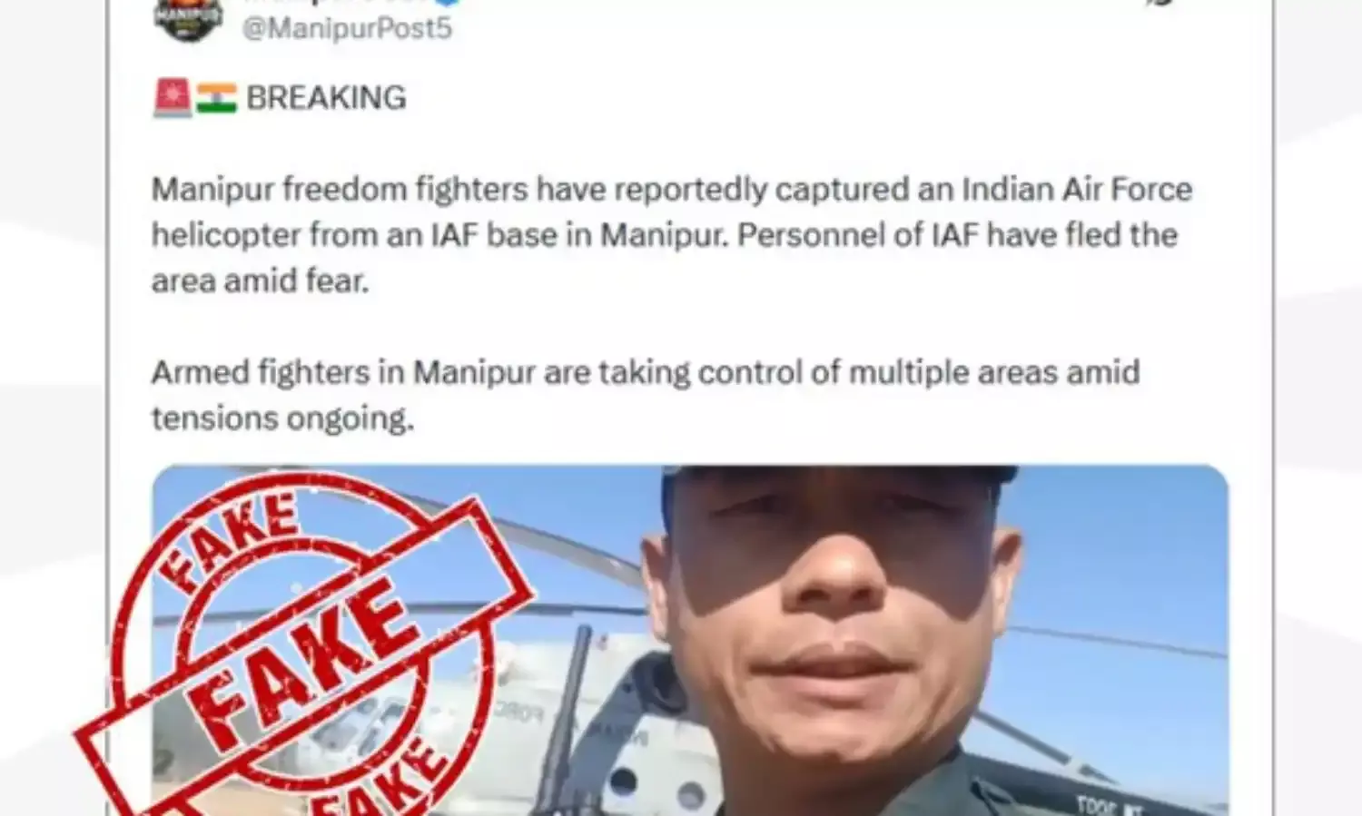 पीआईबी ने सोशल मीडिया पर वायरल हो रहे एक वीडियो को फर्जी करार दिया है। वीडियो में दावा किया गया था कि मणिपुर के स्वतंत्रता सेनानियों ने मणिपुर स्थित भारतीय वायु सेना के बेस में एक हेलीकॉप्टर पर कब्जा कर लिया, जिसके बाद सेना के जवान डर की वजह से वहां से भाग गए।