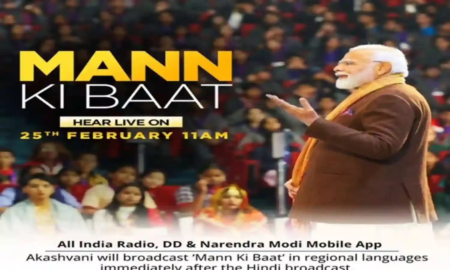 मन की बात कार्यक्रम आकाशवाणी और दूरदर्शन के पूरे नेटवर्क, AIR न्यूज वेबसाइट और Newsonair मोबाइल ऐप पर प्रसारित किया जाएगा. इसे आकाशवाणी समाचार, डीडी न्यूज, पीएमओ और सूचना एवं प्रसारण मंत्रालय के यूट्यूब चैनलों पर भी लाइव-स्ट्रीम किया जाएगा। हिंदी प्रसारण के तुरंत बाद आकाशवाणी क्षेत्रीय भाषाओं में कार्यक्रम प्रसारित करेगा.