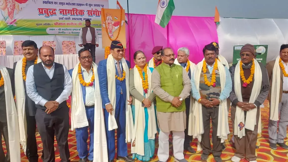 भारत माता के गुमनाम बलिदानियों को श्रद्धा सुमन अर्पित करें। उनके स्वप्न को पूरा करें। 75 वर्ष में हम कहां हैं। हमारा देश महान था, है और रहेगा।कार्यक्रम की अध्यक्षता कर रहे कर्नल हुकुम सिहं विष्ट ने कहा कि विश्व का सबसे प्रसिद्ध व लोकप्रिय गीत हमारा राष्ट्रीय गीत वंदे मातरम है। हम आज इस कार्यक्रम में आकर प्रफुल्लित हैं। यह भव्य कार्यक्रम अमर क्रांतिवीरों को सच्ची श्रद्धाजंलि है। इस अवसर पर मुख्य अतिथि सह प्रान्त प्रचारक मनोज जी ने महामहिम राष्ट्रपति के विशिष्ट सेवा मेडल से सम्मानित एयर वाइस मार्शल जी एस विश्वनाथन,सूबेदार मनोज सिहं चौहान सहित17 पूर्व सैनिकों को माला पहनकर व अंगवस्त्र भेटकर सम्मानित किया गया।कार्यक्रम का संचालन मुकेश दीक्षित ने किया। कार्यक्रम का समापन सामूहिक वंदे मातरम गायन व भारत माता की आरती के साथ हुआ।इस अवसर पर जिला प्रचारक आत्म प्रकाश,जिला कार्यवाह अजीत, सामजिक समरसता विभाग के संयोजक महेन्द्र मिश्रा,बौद्विक विभाग प्रमुख विजय प्रकाश द्विवेदी, प्रचारक रज्जन, खंड संघ चालक दिनेश चन्द्र शर्मा जी,अशोक तिवारी, हंसराज समेत हजारो लोग मौजूद रहे।