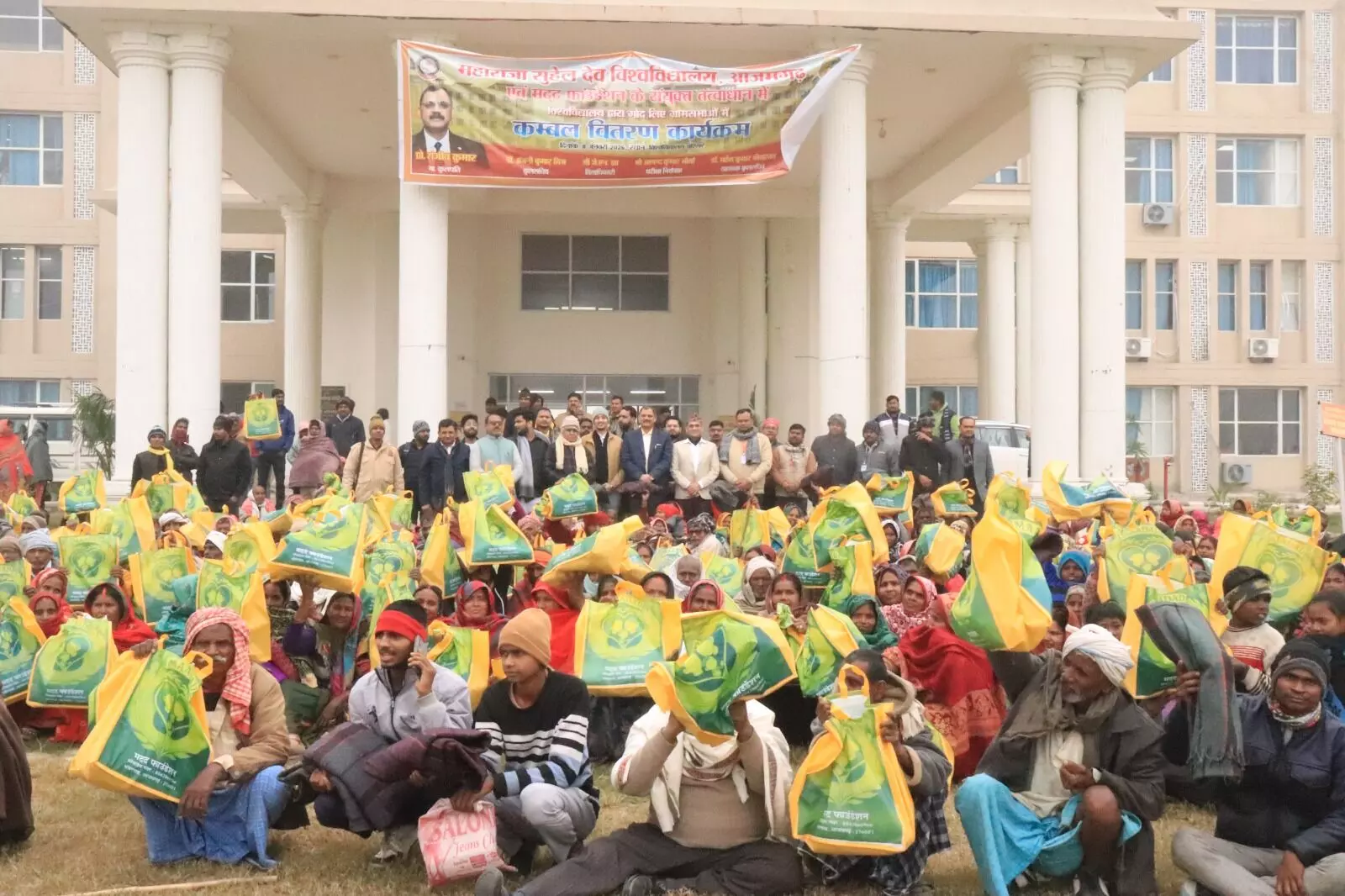 विश्वविद्यालय सामाजिक उत्तरदायित्व के अंतर्गत महाराजा सुहेलदेव विश्वविद्यालय तथा मदद फाउंडेशन भंवरनाथ, आजमगढ़ के संयुक्त तत्वाधान में विश्वविद्यालय द्वारा गोद लिए गए 5 ग्राम समेंदा, सीही, महरुपुर, सोनपुर और धारवारा के ग्रामीणों को कुलपति प्रो संजीव कुमार ने करीब 500 कंबल का वितरण किए।
