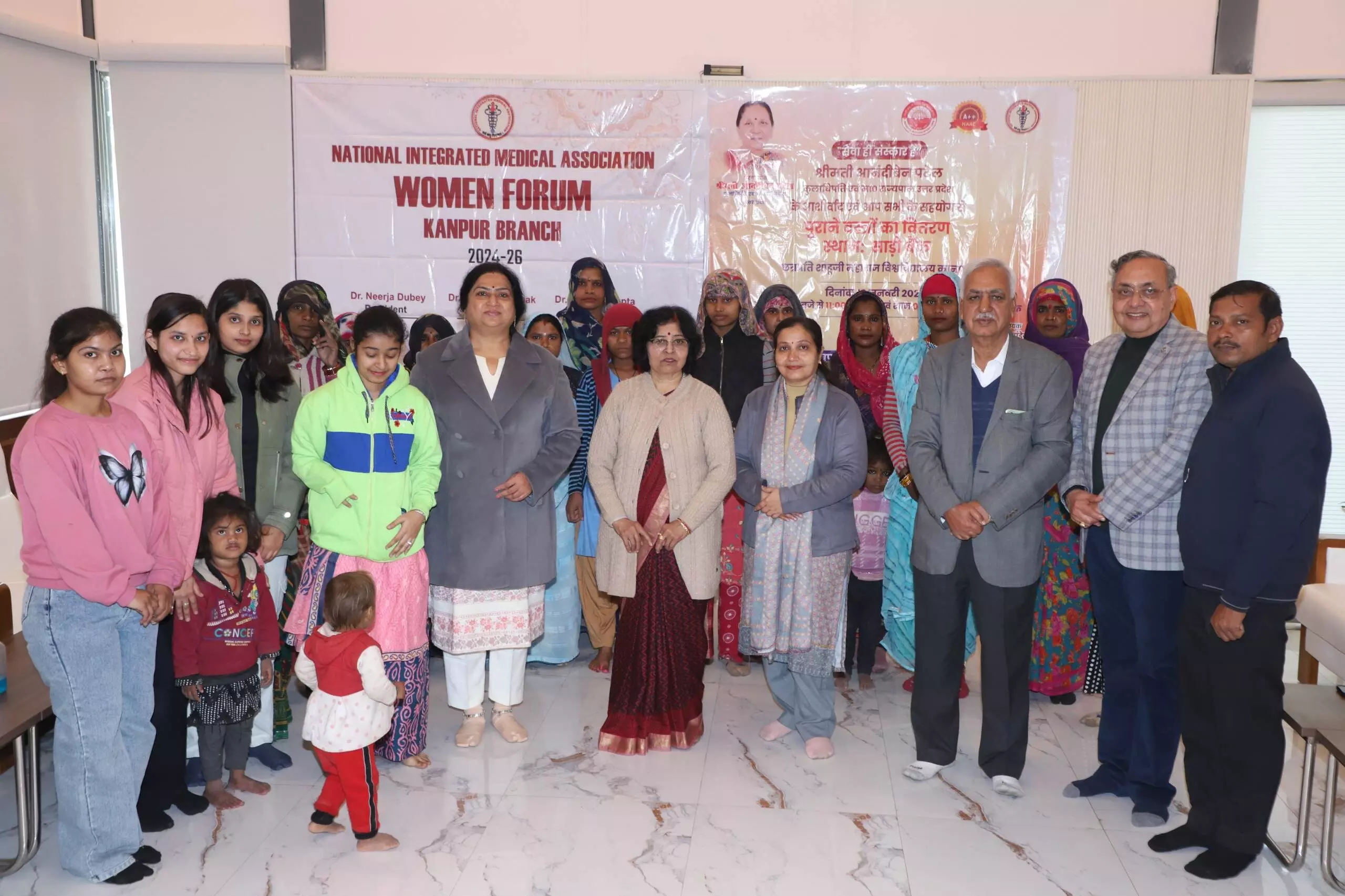 कार्यक्रम का शुभारंभ डॉ. वंदना पाठक (वरिष्ठ आयुर्वेदाचार्य एवं सचिव, नीमा फोरम कानपुर), डॉ. नीरजा द्विवेदी (अध्यक्ष, नीमा वूमेन फोरम कानपुर), डॉ. वी. के. द्विवेदी, डॉ. निरंकार गोयल एवं डॉ. स्नेह पांडे द्वारा किया गया। इस अवसर पर बड़ी संख्या में जरूरतमंद महिलाओं को शीतकालीन वस्त्र एवं आहार सामग्री वितरित की गई।