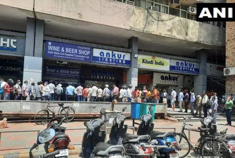 दिल्ली के मुख्यमंत्री अरविंद केजरीवाल द्वारा शहर में 6 दिन के लॉकडाउन के ऐलान के बाद शराब की दुकानों पर भारी भीड़ उमड़ने लगी है। शहर के कई ठेकों के बाहर शराब के शौकीन सोशल डिस्टेंसिंग का पालन करते हुए शराब खरीद रहे हैं लेकिन ज्यादात्तर ठेकों के बाहर सोशल डिस्टेंसिंग के नियम की धज्जियां उड़ाई जा रही है।