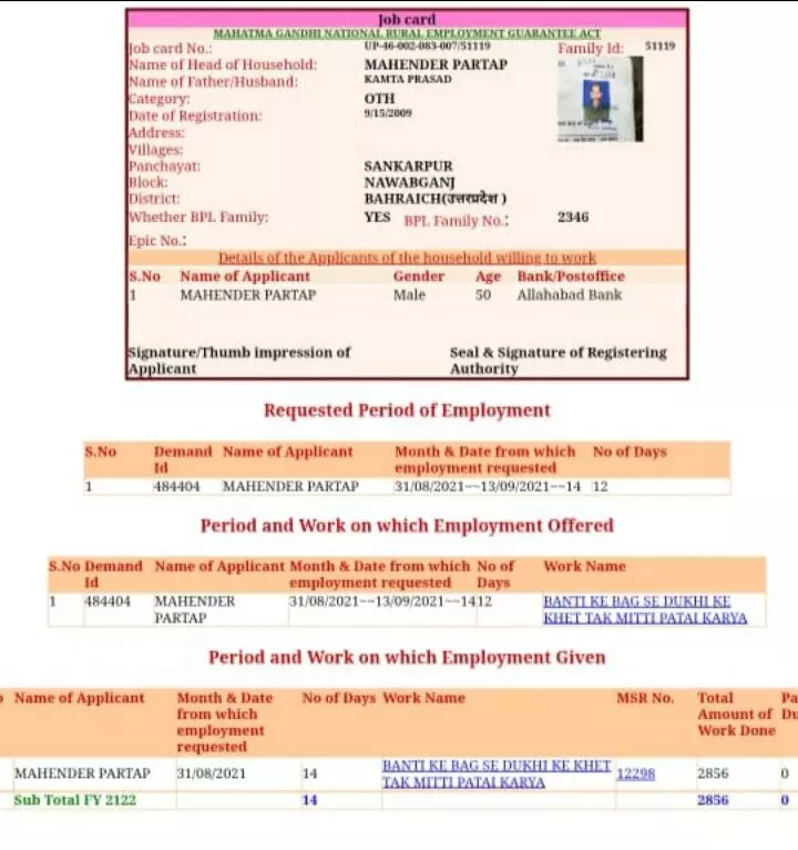मनरेगा योजना में आम इंसान और प्रवासी मजदूरों से काम लेना तो आपने सुना होगा, लेकिन जब बात मुर्दे से काम लिए जाने की हो वह भी एक व दो दिन नहीं बल्कि पूरे 14 दिन इतना ही नहीं काम के एवज में 2346 रूपये का भुगतान हेतु भेजे गए है। जबकि इनकी मृत्यु 23 नम्बर 2018 में हो चुकी है। इस सम्बंध में जब सहायक विकास अधिकारी नवाबगंज से बात की गई तो उन्होंने बताया कि यह प्रकरण मनरेगा से सम्बंधित है इसके सम्बन्ध में हमारे पास कोई डाटा मौजूद नही है।