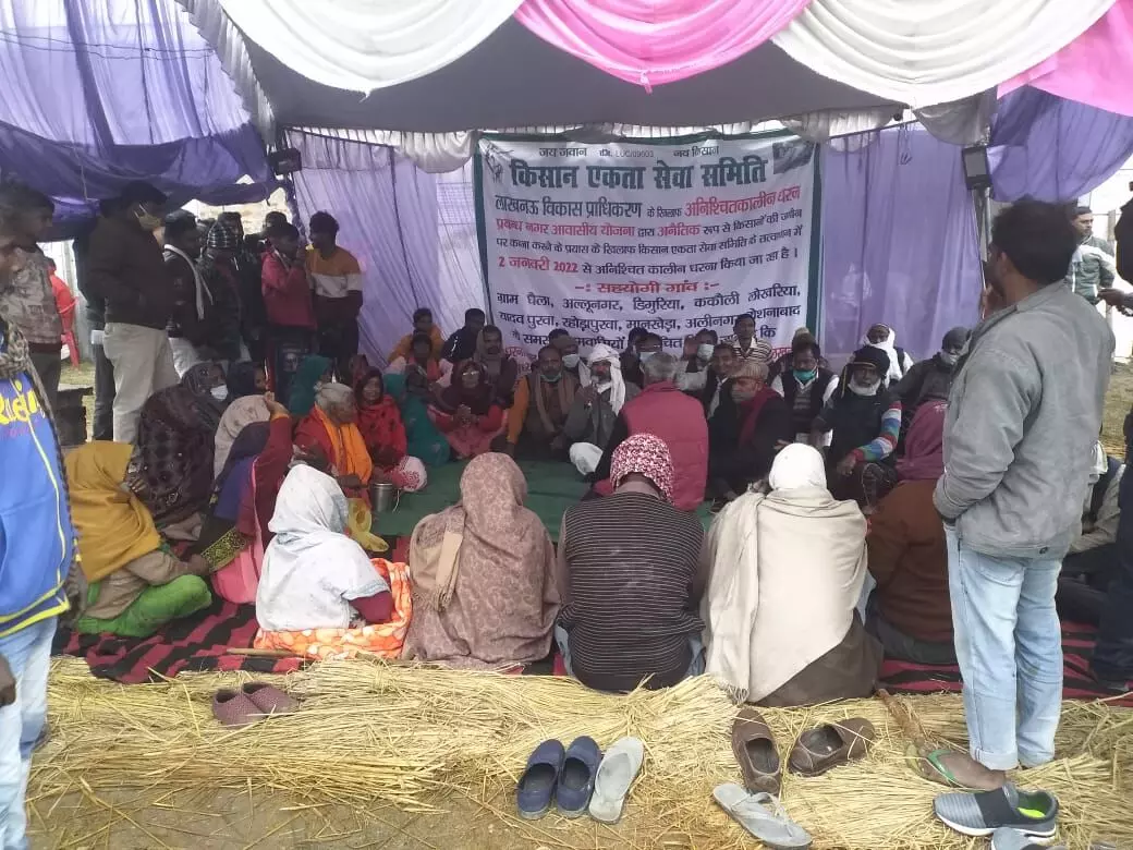 राजधानी लखनऊ के बीकेटी विधानसभा क्षेत्र अंतर्गत घैला ग्राम पंचायत, अल्लू नगर, डिगुरिया, ककौली, लोखरिया, यादव पुरवा, राहोडपुरवा, मानखेड़ा, अलीनगर, तथा रोशन बाद ग्राम पंचायत के किसानों द्वारा प्रबंध नगर आवास योजना की भूमि अर्जन मुक्त किए जाने के संबंध में लगातार अनिश्चितकालीन धरना दिया जा रहा है। धरने को लगभग एक सप्ताह हो गया है लेकिन अभी तक किसी भी विभागीय उच्च अधिकारी ने किसानों से उनका और सा हाल नहीं लिया है। ठंड के मौसम में हाड़ कंपा देने वाली हवाएं और बारिश में भी किसान अपनी जमीनों को एलडीए से मुक्त कराने कि अपनी मांगों को लेकर अनिश्चितकालीन धरने पर बैठे हुए हैं। किसान एकता सेवा समिति के अध्यक्ष बाबा रामसेवक दास ने बताया कि लगभग 15 वर्षों से लगातार हमारी मांगों को दरकिनार किया जा रहा है। जिसको लेकर किसान सेवा समिति ने अनिश्चितकालीन धरने का आवाहन किया है। लेकिन कई दिन गुजर जाने के बाद भी अभी तक कोई बड़ा अधिकारी हमारी सुध लेने नहीं आया। किसान एकता सेवा समिति ने के अध्यक्ष बाबा रामसेवक दास ने कहा कि यदि हमारी मांगों को नहीं सुना गया तो हमारी समिति उत्तर प्रदेश विधानसभा चुनाव 2022 में वोट का बहिष्कार करेगी। बताते चलें की इन गांव में तकरीबन 20 से 25000 वोटर हैं। किसान एकता सेवा समिति के अध्यक्ष बाबा रामसेवक दास, उपाध्यक्ष अवधेश यादव प्रधान अल्लू नगर, तथा घैला के प्रधान उबेद अली, का कहना है कि समय रहते अगर किसानों की समस्या का समाधान नहीं होता है, तो वह उत्तर प्रदेश विधानसभा चुनाव 2022 में वोट नहीं डालेंगे और चुनाव का बहिष्कार करेंगे।
