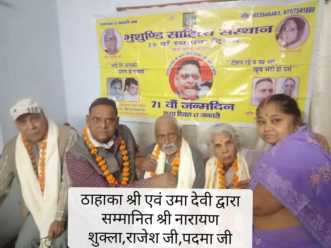इसके साथ ही साहित्यकार श्री नारायण शुक्ल को साहित्य भुशुण्डि व्यग्य रत्न से, श्रीमती पदमा सक्सेना को साहित्य भुशुण्डि भजन रत्न सम्मान से, डॉ दिनेश चन्द्र अवस्थी लखीमपुर को साहित्य भुशुण्डि हास्य व्यंग्य रत्न सम्मान एवं वरिष्ठ पत्रकार प्रदीप खंडेलवाल को साहित्य भुशुण्डि पत्रकार सम्मान रत्न से सम्मानित किया गया रालामऊ के कवि केदारनाथ शुक्ल अपनी व्यंग्य रचनाओं से हँसाया "नये वर्ष पर कर रहा स्वागत ओमिक्रोन, बदल गई आज कल योगी जी को टोन ।।" डॉ दिनेश चन्द्र अवस्थी ने नेताओं की फितरत दोहे से बतायी बड़े बड़े नेता सभी होते जैसे पेड़। जुड़ी रहे अन्दर जड़े ऊपर मुठभेड़ "सीतापुर के कमलेश मौर्य 'मृदु ने सुनाया तो श्रोता अपनी हँसी रोक न सके | "अब न चीन से, न पाकिस्तान से डर लगता है। हमें तो बस ओमीक़ोन से डर लगता है।